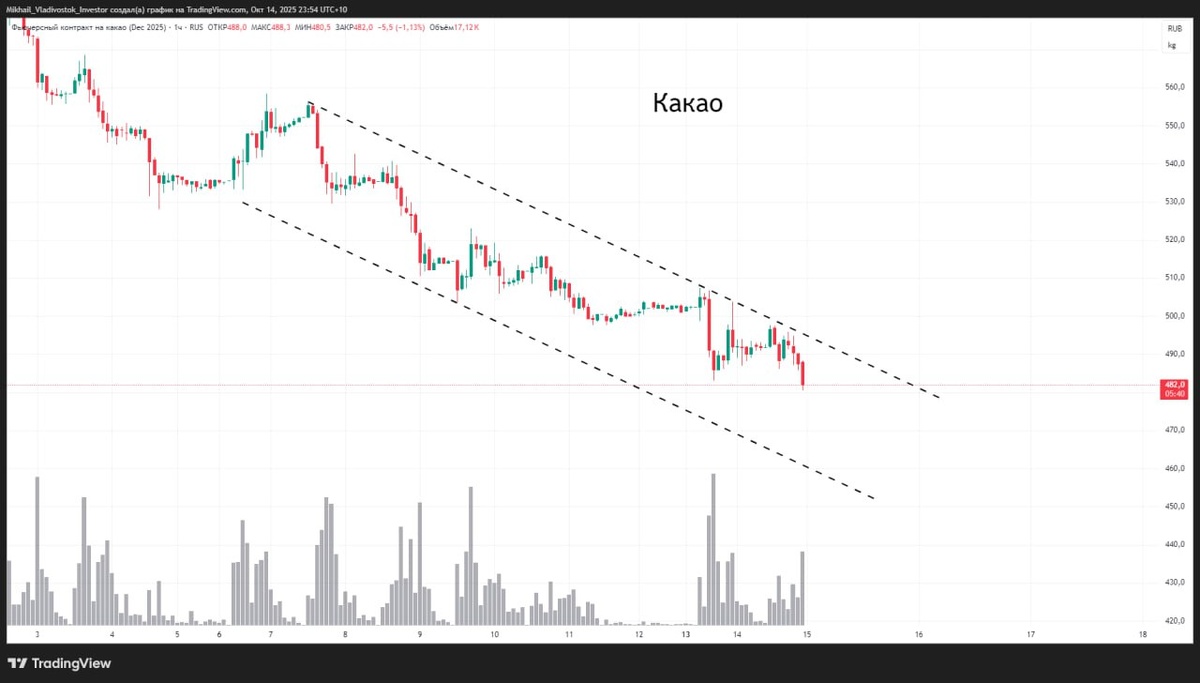 К какао тоже кстати стоит присмотреться в шорт Таймфрейм 1 час Нисходящий тренд. Спроса нет. Большая вероятность продолжения движения. #какао #фьючерс #шорт