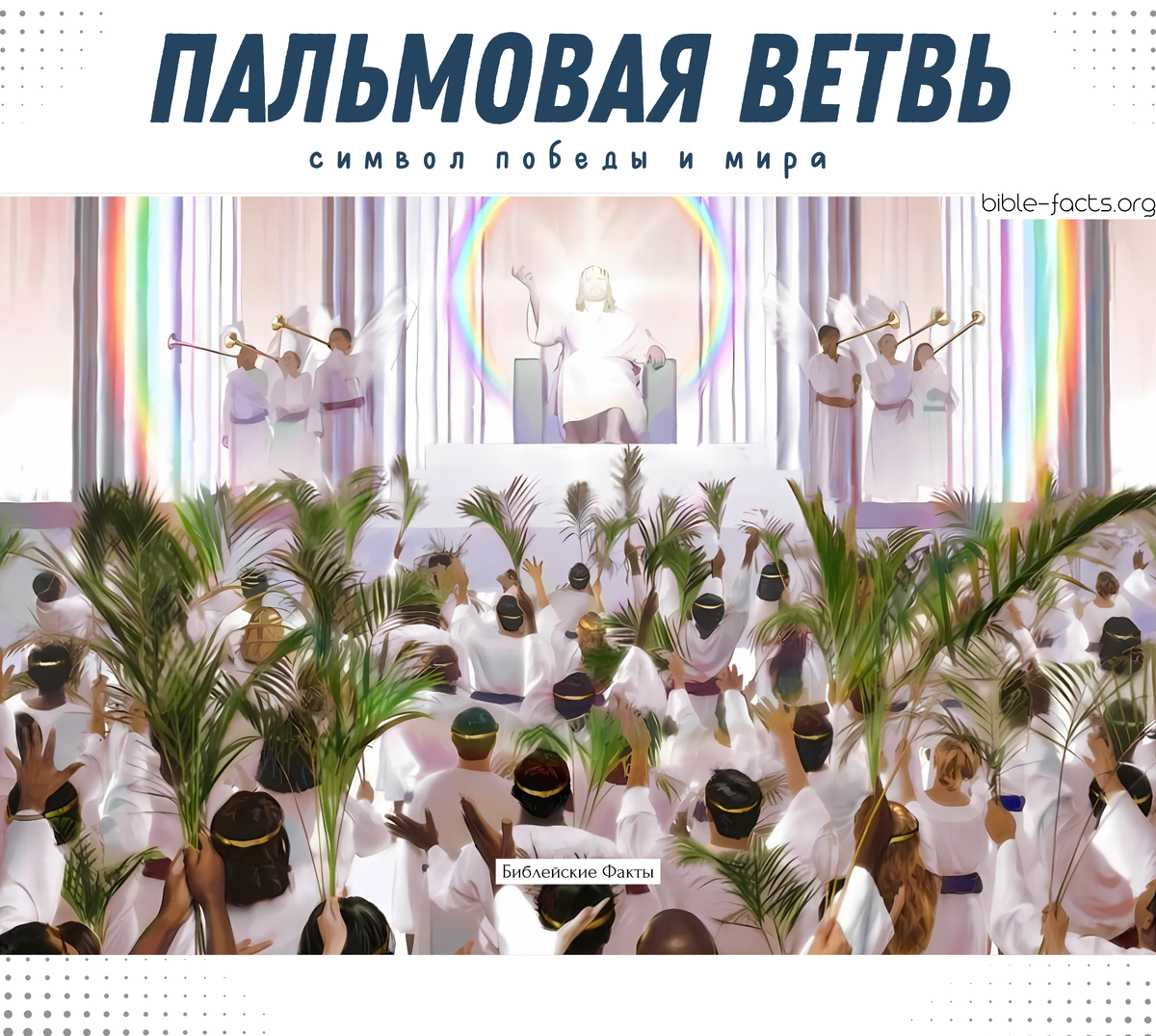 А вы знали, что пальмовые ветви неразрывно связанны с ключевыми библейскими событиями? Ими встречали Иисуса при входе в Иерусалим, приветствуя как Царя-Победителя. В праздник Суккот ими радовались пред Господом (Лев 23:40), а в раннем христианстве пальмовая ветвь стала знаком мучеников, сохранивших веру до конца. На катакомбных фресках часто изображали мучеников с пальмовыми ветвями. В книге Откровение праведники предстают перед престолом Божьим «в белых одеждах и с пальмовыми ветвями в руках» — символом вечного торжества спасённых. В древнем мире, как в Иудее, пальмовая ветвь была символом победы, триумфа и мира. • Телеграмм канал (Библейские факты) • Больше интересных Библейских Фактов (VK) • Библейские факты (сайт)