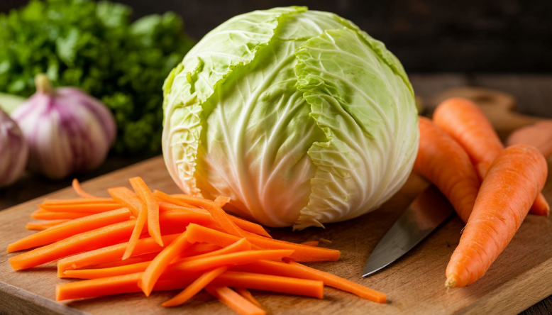 - Капусту шинкуем тонкой, изящной соломкой. Морковь натираем на крупной терке. Не мельчите — нам нужна текстура!