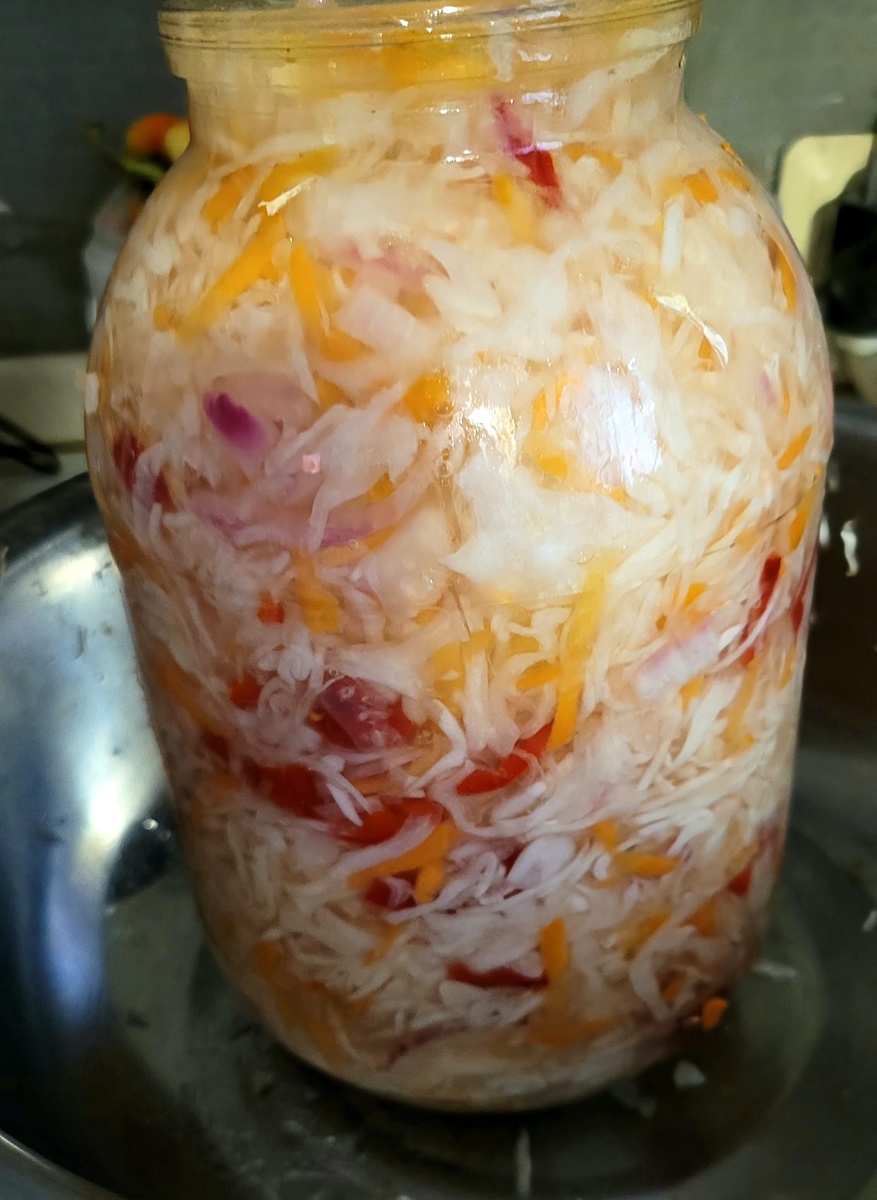 Здравствуйте, дорогие друзья и гости канала. Я очень давно готовила такую капусту примерно по такому рецепту. Но там было 5 кг капусты. Хранилась она в погребе очень хорошо и мы всю ее с удовольствием съели. И когда я занесла на кухню большой сочный вилок, то мне сразу же захотелось приготовить именно такую капусту. Сначала я напишу рецепт на 3 л банку.Рецепт взяла из интернета. Свежая капуста - 1 небольшой кочан Чесночок- 3 зубчика Лук репка - 1-2 шт. Сладкий перец ( красный) - по вкусу. Любая зелень по вашему усмотрению. Маринад: Чистая вода-1,5л Соль- 2 ст л Подсолнечное масло-1/2 стакана Сахар- 4 ст л Уксусная эссенция 70% - 1 ст. л. Приготовление: Это сегодня вечером я лакомилась этим полезным салатом. Только не забудьте при приготовлении маринада добавить уксус. Как это сделала я. Пришлось потом добавлять. А я сделала на 2 л банку, потому что 3л мне многовато. Я даже взвесила капусту. Капуста -650 г Морковь - 1 шт. Лук - 1 шт Чеснок 5 зубчиков (люблю поострее) Перец красный -