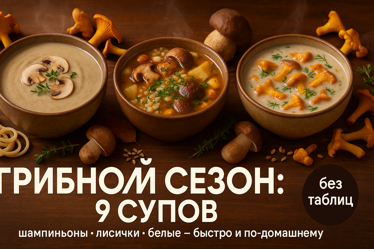 Привет! Я — та, кто приходит с рынка с трескучими пакетами, длинно обсуждает с продавцами, где росли эти лисички, и уже дома отчитывает шампиньоны влажной салфеткой, а не водой — чтобы не потеряли аромат. Здесь — 9 живых карточек: ингредиенты в граммах, посуда, диаметр кастрюли, мощность, точные минуты и нюансы, которые дают глубину вкуса. Рецепты — проверенные временем и кухнями: от французского крем-супа до русского ячменного, от «лесной» классики до лёгкого фьюжна. Поехали!