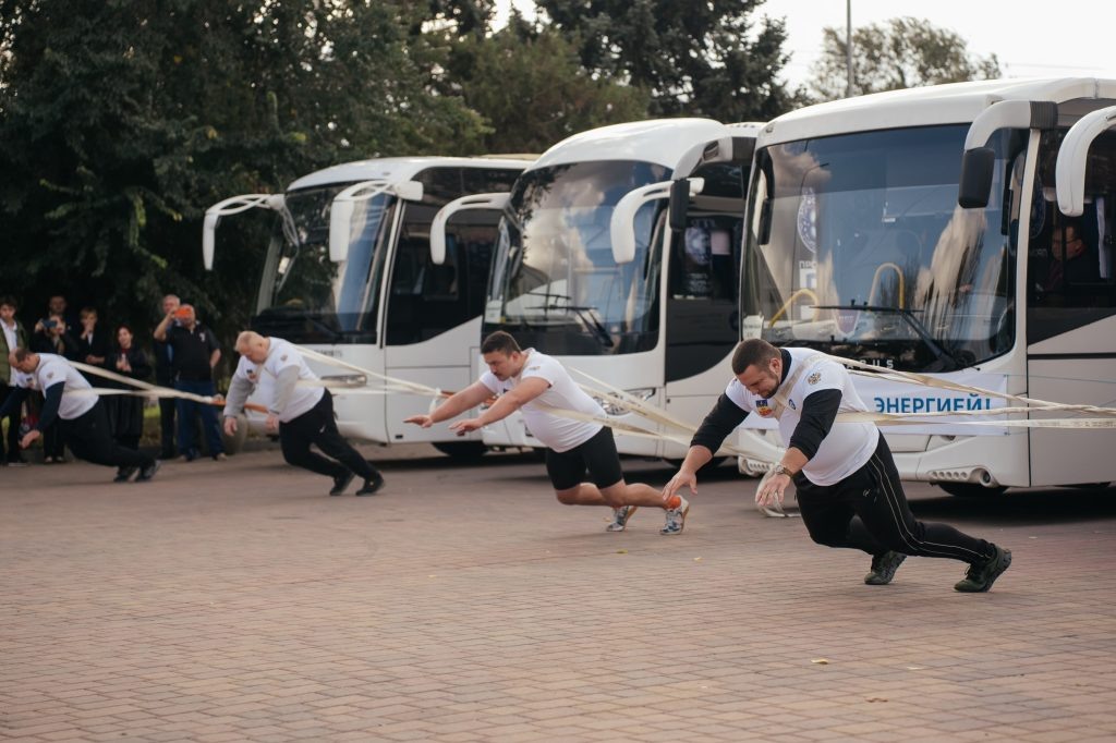 Событие состоялось в рамках Дня Волгодонска на региональной экспозиции «Дни муниципальных образований» Рекорд России по параллельной буксировке автобусов установили силачи международного богатырского движения «Сильнейшая нация мира» при поддержке Ростовской атомной станции. Пяти спортсменам удалось протащить на 20 метров пять автобусов общей массой почти 68 тонн за 48 секунд. Уникальное достижение было зафиксировано в рамках презентации достижений Волгодонска в г. Ростове-на-Дону на площадке исторического парка «Россия — моя история»* и приурочено 80-летию атомной промышленности**, которое празднуется в этом году. Самый южный атомград России — Волгодонск в этот день был представлен достижениями и презентациями своих предприятий, выступлениями творческих коллективов и мастер-классами, театрализованными представлениями и экспозициями народных промыслов. Специальным гостем выставки стал титулованный боксер-профессионал Дмитрий Кудряшов. Стенд крупнейшего энергетического предприятия Юга Ро