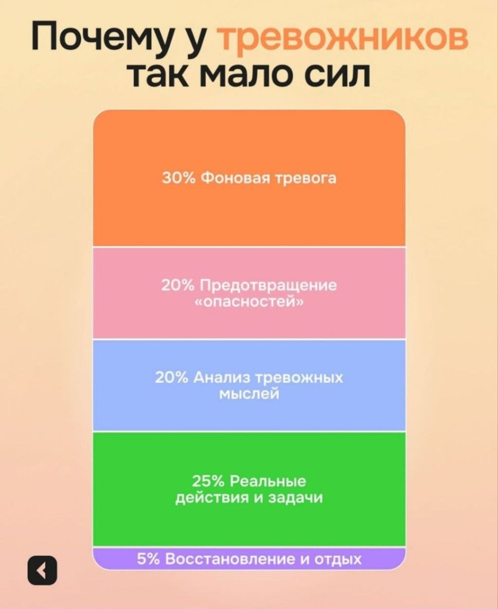 Длительная тревога ощущается как постоянная усталость, упадок сил, плохое настроение, трудности с концентрацией внимания. Когда организм окончательно истощается, возникает нервная астения и, чтобы обратить на себя внимание, организм генерирует СИМПТОМ: панические атаки, различные фобии (страхи), навязчивые мысли и действия, ком в горле, депрессии и т.д. У кого может быть ГТР (Генерализованное Тревожное Расстройство), то есть длительная тревога: 1. Невротики. У "невротиков" тревога возникает в результате внутреннего субъективно неразрешимого противоречия, то есть внутреннего конфликта. Пример: 🟢Жену разлюбил, люблю коллегу, но развестись не могу, потому что это предательство 🟢Устала заниматься с утра до вечера семьей и бытом, хочу на вечеринку, но не могу себе позволить, потому что неприлично 🟢Устал от работы на работодателя, всё бесит, но боюсь уходить, вдруг на себя не получится Терапия: принять решение и разрешить внутренний конфликт. 2. У "пограничников" тревога воз