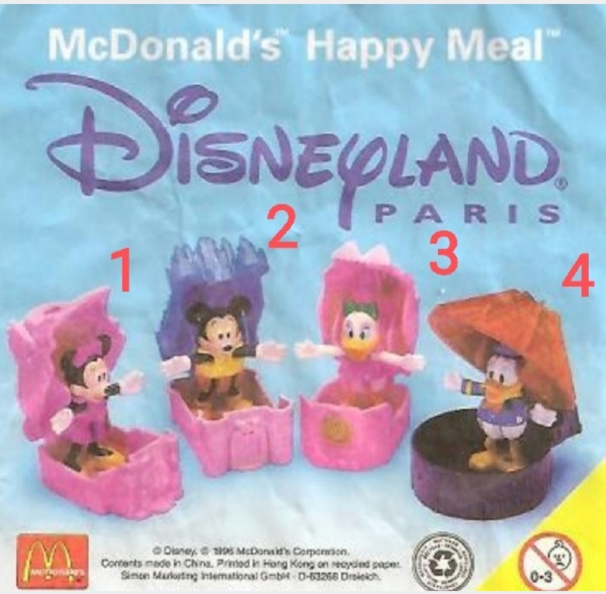 В данной серии четыре игрушки выполненные в виде шкатулок с нашими любимыми героями внутри. 1. Минни Макс 2. Микки Маус 3. Дейзи Лак 4. Дональд Дак В моей коллекции есть следующие игрушки: Другие серии посвящённые Disneyland Paris: Disneyland Paris 1997 Disneyland Paris 2000 Disneyland Paris 2001 Disneyland Resort Paris 2003 Если интересуют другие игрушки из McDonald's , то переходим на Главную страницу