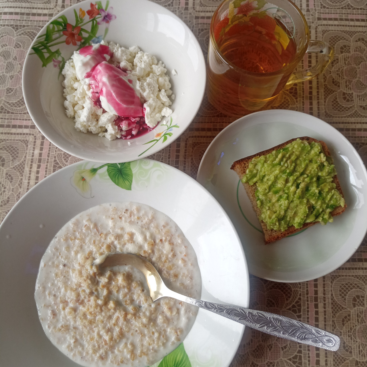 Вот такой у меня сегодня был завтрак. Творога тут грамм сто, полила его вишнёвым сиропом и пять ложек каши. Бутерброд с авокадо на чайном блюдце, если что. А то вам, возможно, покажется, что он гигантский)). Я наелась и мне хватило этих калорий на три часа.