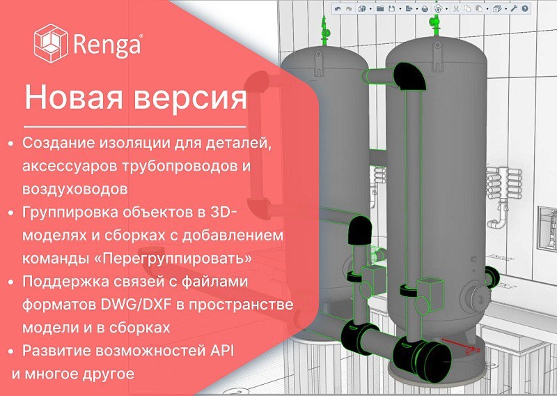 Новая версия Renga: всё дело в деталях Компания Renga Software представляет новую версию Renga редакций Standard и Professional. В релизе разработчики сделали акцент на мощном развитии ранее представленных инструментов изоляции инженерных систем и работы с группировкой объектов, а также была реализована ожидаемая проектировщиками поддержка динамических связей с чертежами DWG/DXF в 3D-модели и сборке. ➡️В вышедшем обновлении появилась возможность создавать многослойную изоляцию для деталей и аксессуаров трубопроводов и воздуховодов. Особенно ценно это будет для инженеров-проектировщиков и технологов, поскольку позволяет изолировать все объекты трассы, значительно упрощая формирование различных спецификаций для учета расхода материалов в проекте. ➡️Продолжилось усовершенствование инструментов управления объектами, был расширен функционал команд «Сгруппировать», «Разгруппировать» на объекты 3D-вида и сборки. В группы можно объединять не только отдельные объекты, но и существующие групп