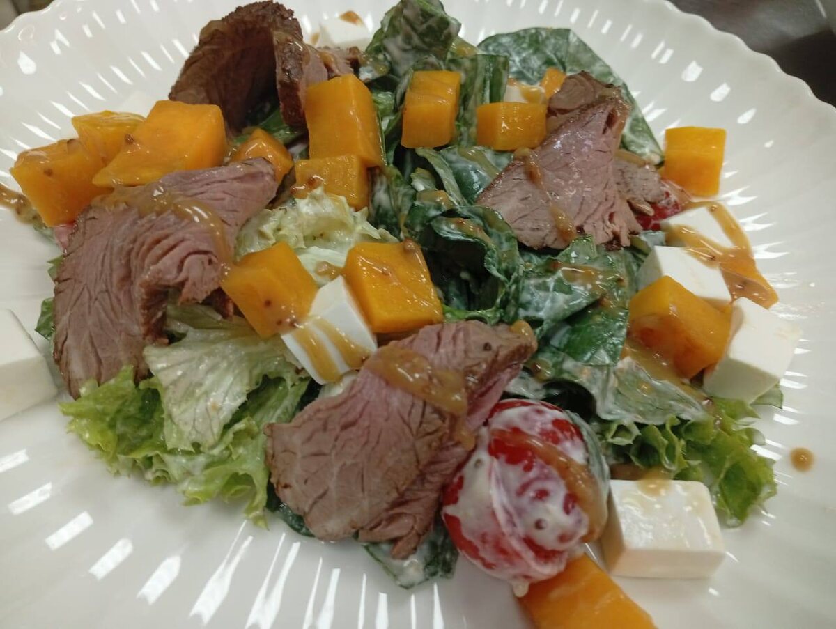 Салатик с ростбифом и тыквой с двумя заправками /медово -горчичный и соус дор-блю