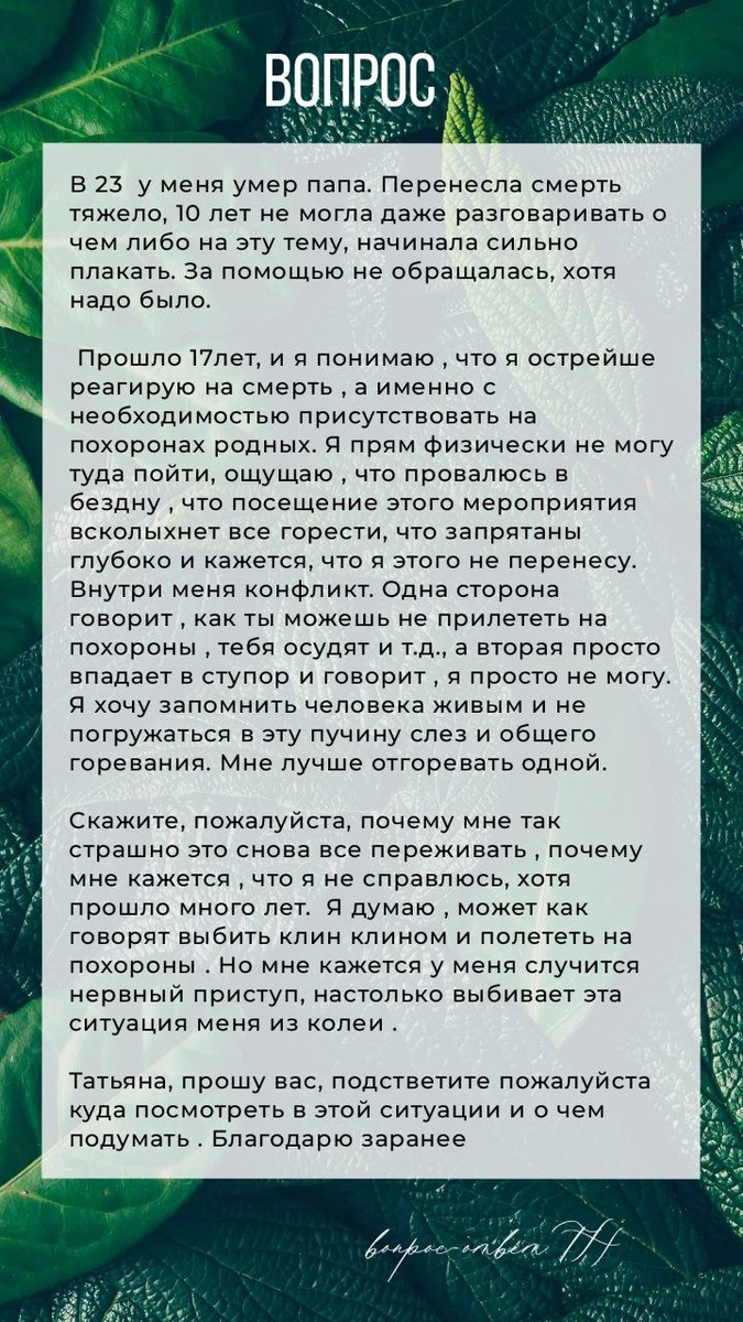 Я вам сопереживаю в вашей утрате, когда мы теряем родителей - это всегда непросто, особенно если была сильная привязанность. 🔸️ За помощью обратиться никогда не поздно 🔸️ Не обязательно присутствовать на похоронах родных, здесь каждый решает сам. Умершему вообще все равно, пришли или нет. Главное - память 🔸️ Даже если присутствовать, то можно, например, только на церемонии отпевания и/ или гражданской панихиды, а само захоронение не посещать. Или наоборот. Или только на поминки прийти. Я была беременна сыном, когда умерла моя любимая бабушка. Я сидела в сторонке в церкви, к телу не подходила и на кладбище не ездила. 🔸️ Я бы поработала со страхом осуждения. 🔸️Почему так страшно: вероятно действительно не отгоревана утрата папы. Плюс это не лучшие воспоминания 💔 Я бы также очень рекомендовала слушать свое тело, использовать телесные практики и обратиться к телесному терапевту. Почему-то мне здесь так видится. Приходите в Death cafe, где говорим обо всем, что страшно и не