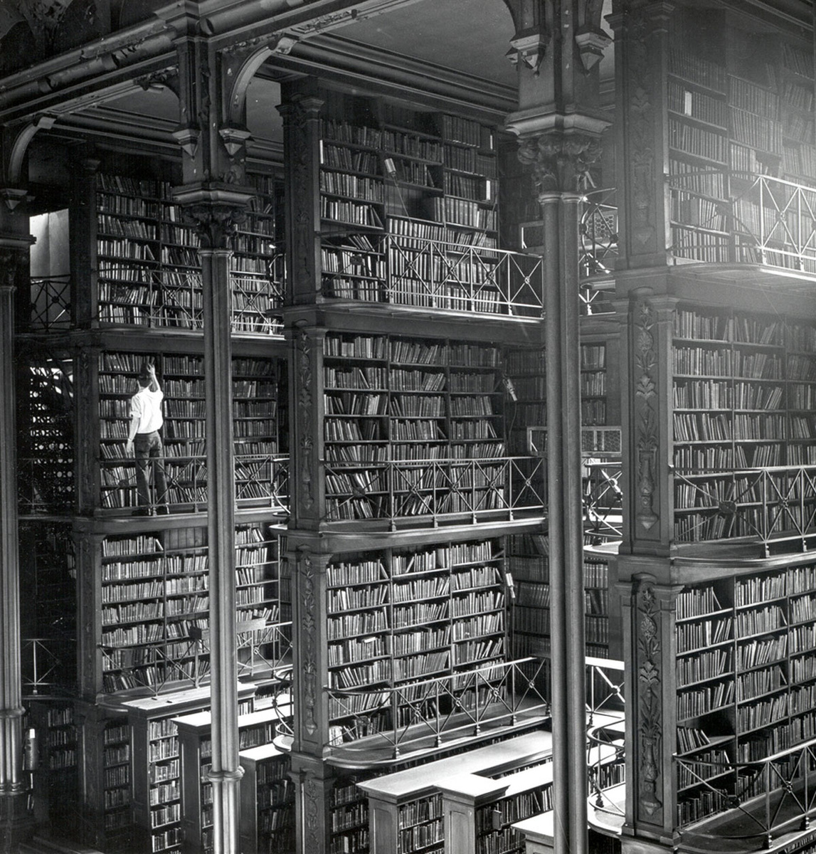 2. Мужчина ищет книги в старой публичной библиотеке города Цинциннати, США. Здание снесли в 1955 году, сейчас на его месте — офисное здание и парковка.