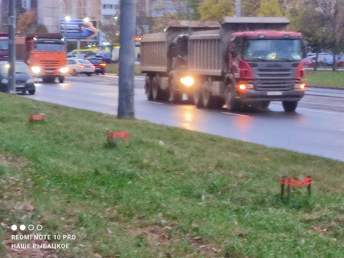 Напротив Дельмара занята одна полоса. Эти грузовики стоят на месте.