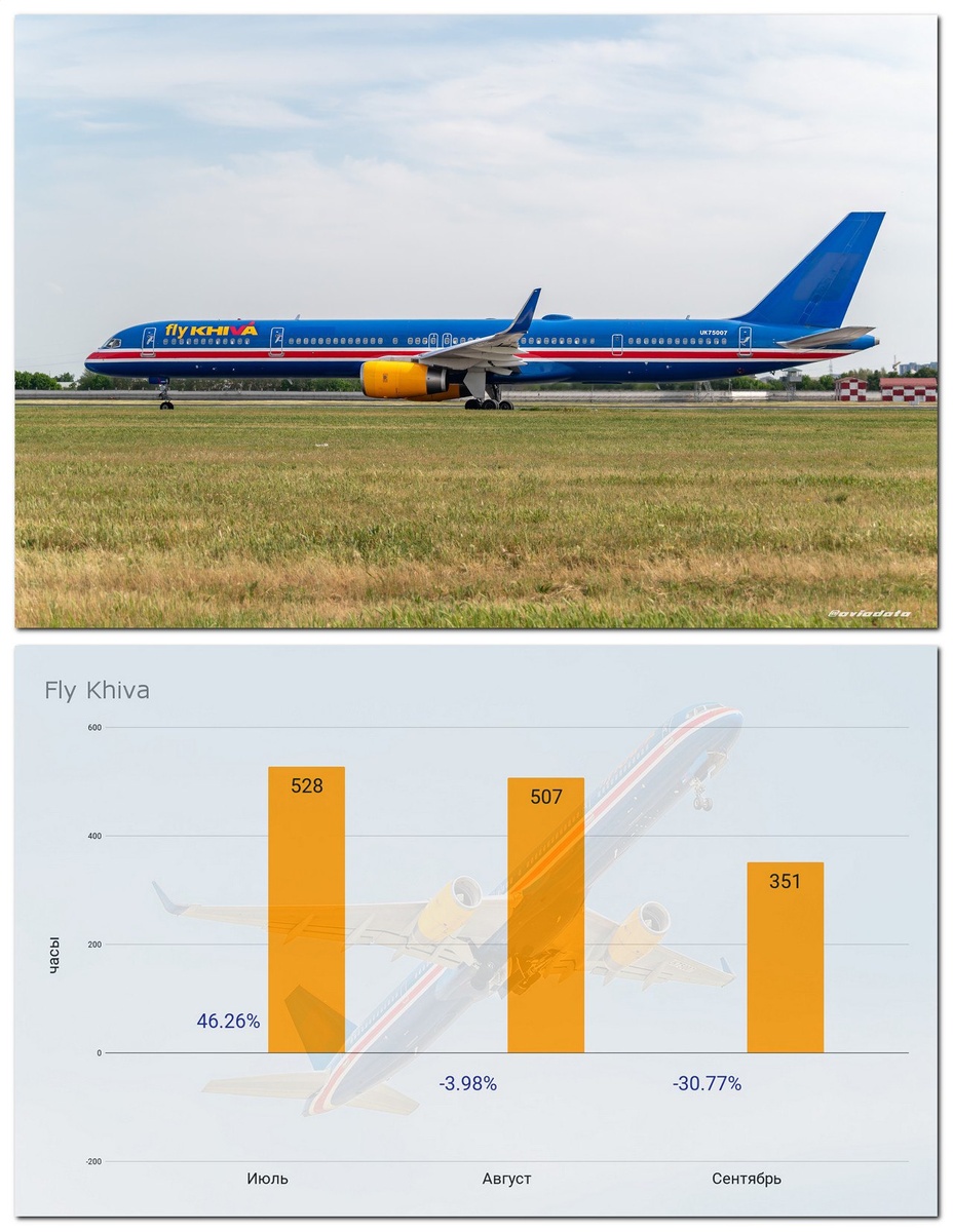Итоги сентября: Fly Khiva В связи с продолжающимся техническим обслуживанием самолётов, общий налёт авиакомпании в сентябре снизился. Среднесуточный налёт на одно воздушное судно уменьшился ⬇️ на 28.34% и составил 3.54 часа. Суммарное количество часов налёта воздушных судов авиакомпании Fly Khiva (включая грузовой) за сентябрь уменьшилось 🔽 на 30.77% по сравнению с августом и составило 351 час. Общая динамика за последние 3 месяца представлена на графике. #статистика #flykhiva #сентябрь2025
