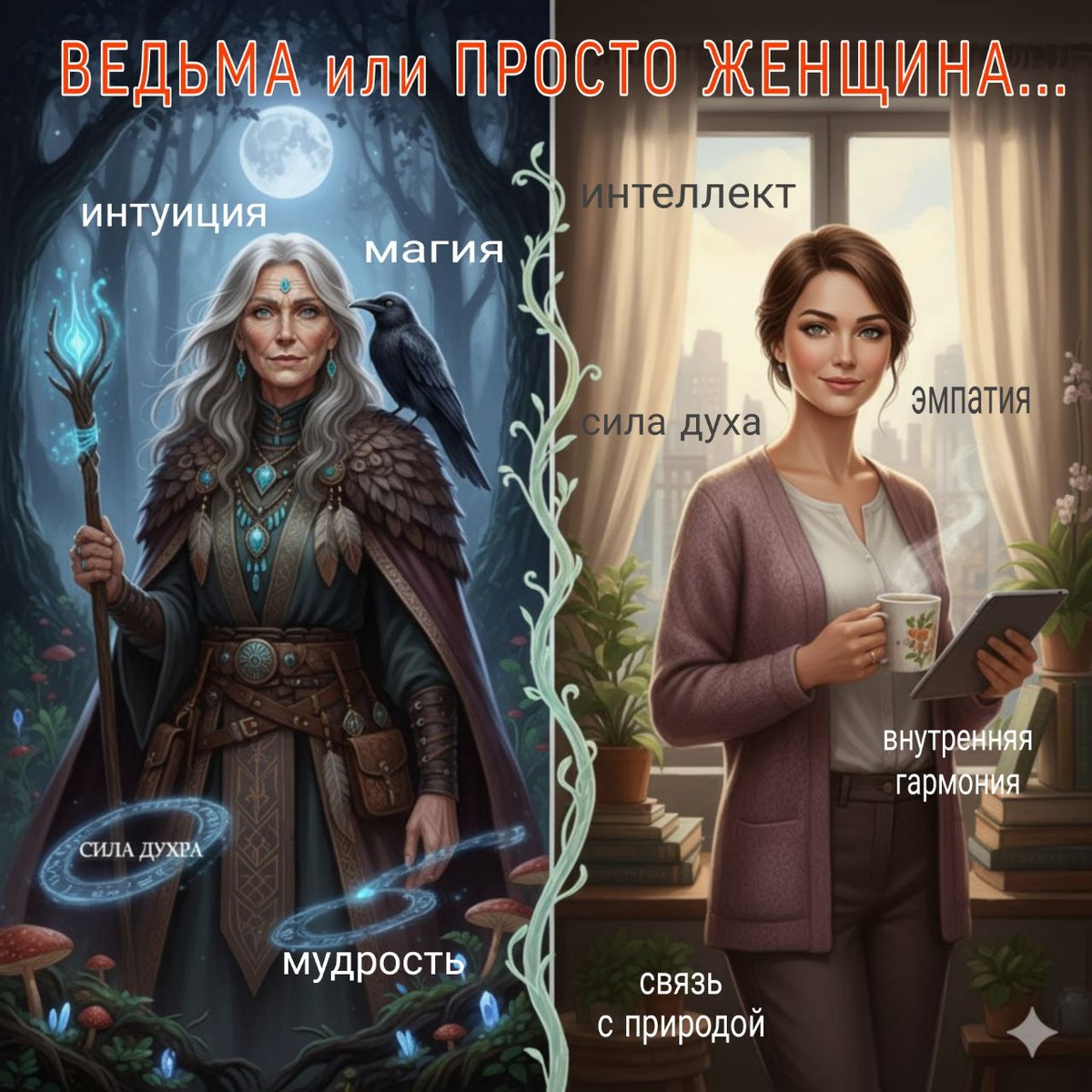 Слово «ведьма» исторически означает «ведающая мать» - женщина, обладающая знанием, мудростью и связью с природой. Это не сказочная злодейка, фея или колдунья, а хранительница традиций, целительница и провидица. Чем же ведающая женщина отличается от современной женщины, живущей в ритме мегаполиса? Разберём не только мистические, но и вполне земные качества. 1. Исторический контекст: кто такие ведающие женщины? На Руси ведуньями становились те, кто: - Знала травы, заговоры и ритуалы. - Умела «читать» знаки природы (по птицам, облакам, поведению животных, природным циклам). - Выполняла роль психолога, акушерки и судьи в общине. - Знала и чтила Родовые традиции и опыт Их сила была не в «колдовстве», а в глубоком понимании мира. 2. Ключевые качества женщины сегодня : а) Осознанность или Автопилот - Обычная женщина: живёт по шаблонам (работа-дом-соцсети), редко задаваясь вопросами «зачем» и «почему». - Ведунья: постоянно практикует погружение в себя. Она спрашивает: «Как это влияет на меня?