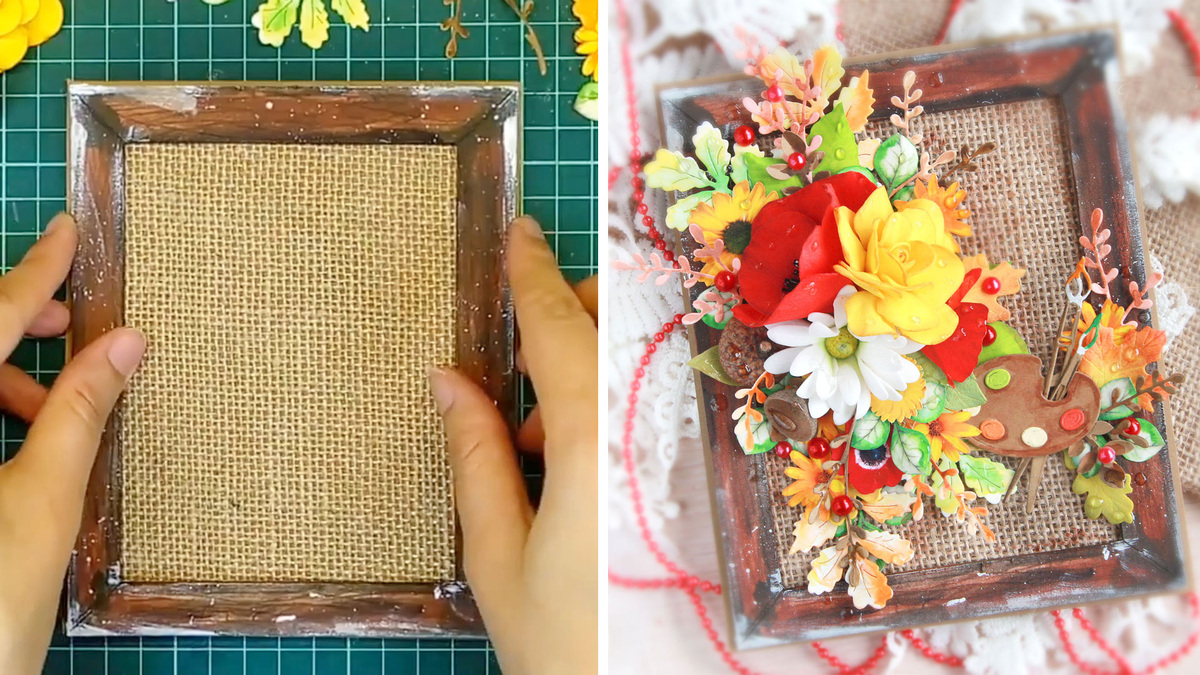 Готовая открытка будет представлять собой небольшую картину с объемной композицией из цветов, листьев и других интересных элементов.