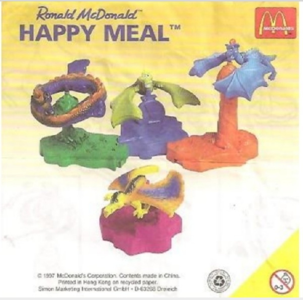 В этой серии игрушек четыре парящих дракона разных цветов, каждый на своей подставке: 1. фиолетовый (на зелёной подставке) 2. зеленый (на фиолетовой подставке) 3. синий ( на оранжевой подставке) 4. желтый (на розовой подставке ) В моей коллекции из этой серии есть следующие игрушки: Если интересуют другие игрушки из McDonald's , то переходим на Главную страницу