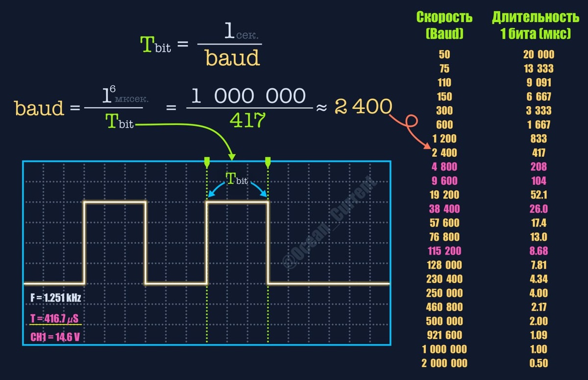 〰️Много тут таких же додиков чудиков задротов ребят как и я, которые возят с собой осцилограф? 😅 〰️Я как-то упоминал, что купил себе "игрушечный" осцилограф, главным преимуществами которого является его размер и цена. В руке лежит как среднестатистический мультиметр. Да и по цене примерно такой же. 🧲 〰️Воспринимать его как лабораторный прибор, конечно, не стоит, но для "полевых" работ - самое оно. 🧲 А шо им делать в этом "поле"? 〰️Мой классический вариант использования это проверка шин данных на предмет наличия там этих самых данных, их baud rate и, что самое главное, правильность подключения. Когда приходится работать с системой, которая существует вне протокола NMEA и где приходится подбирать значения baud rate, то "карманный ослик" - незаменимая вещь. ⚡️⚡️⚡️⚡️⚡️ 〰️На картинке выше я нарисовал то, как данный процесс выглядит: я просматриваю пакет данных, сохраняю его форму волны, а после, используя инструменты, встроенные в осцилограф, - определяю длину одного меандра (бита