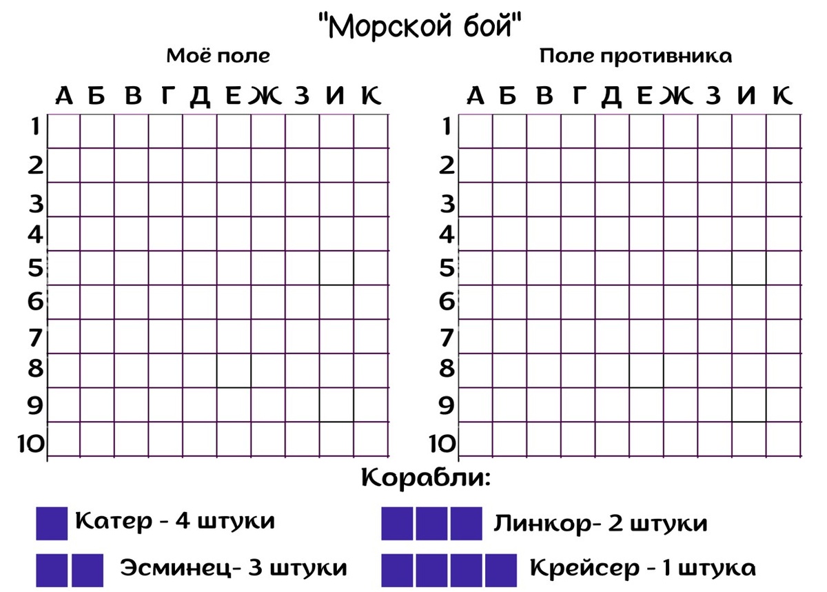 Рисуешь поле 10 на 10, отмечаешь корабли — линкоры, крейсера, подлодки. И вот начинается битва!