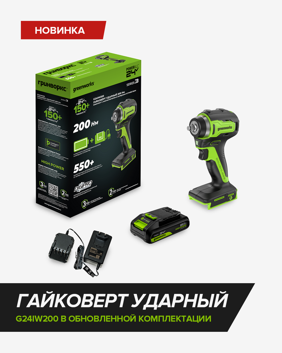 Ищете надежный инструмент для работы с резьбовым крепежом и метизами? Комплект с ударным гайковертом Greenworks G24IW200 (3803607CUA) – ваш идеальный помощник на строительной площадке и в мастерской. ⚡ Оснащен производительным бесщёточным двигателем DigiPro™, который обеспечивает максимальную мощность и эффективность, сохраняя при этом комфорт для рук пользователя. 🔧 Компактный корпус длиной всего 130 мм и эргономичный дизайн с нескользящим покрытием делают работу легкой и безопасной. Теперь ударный гайковерт Greenworks G24IW200 доступен в обновлённом комплекте: ✔️ гайковерт ✔️ аккумулятор 2 Ач ✔️ зарядное устройство ✔️ поясная клипса 👉 Всё необходимое для старта уже включено в комплект! Просто распакуйте и начинайте работу без лишних затрат на дополнительные аксессуары. ✅ Совместим со всеми аккумуляторами платформы POWERALL 24V ✅ Гарантия: 3 года на инструмент и 2 года на АКБ РРЦ: 10 990 руб. Приобрести можно в онлайн и оффлайн-магазинах: Яндекс.Маркет, Ozon, Wildberries. #greenwork