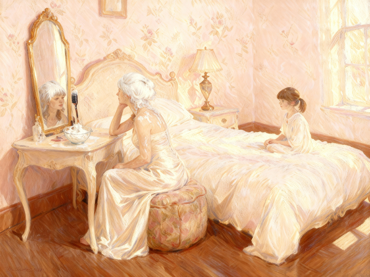 В мягком свете вечерней лампы, окутанная белоснежным свадебным платьем и перчатками, мама танцевала с дочкой. Ее движения были легки и грациозны, как шепот облаков. После танца она склонилась, чтобы прочитать девочке сказку на ночь, голосом, полным ласки. Затем последовал нежный поцелуй в лоб и крепкие, утешающие объятия. А потом мама просто встала и ушла.