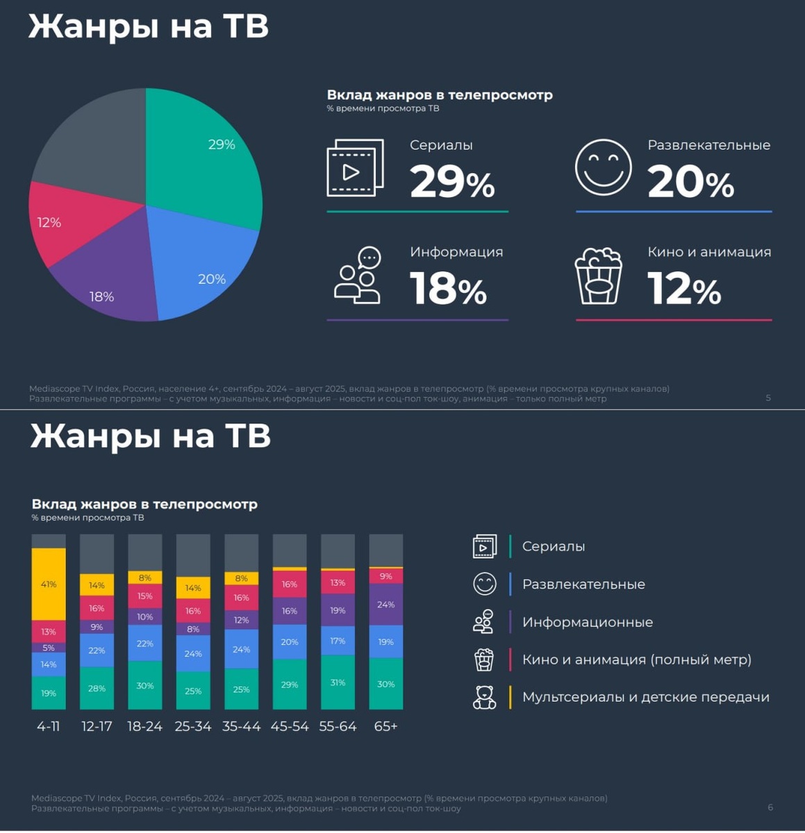 Интересные цифры по пристрастиям аудитории РОСТВ от Секты Свидетелей Медиаскопа. Вклад жанров в телепросмотр: Сериалы 29% Развлекательные программы 20% Информация 18% Кино и анимация 12% Здесь, в общем, и без цифр всё понятно. Простейшее наблюдение за френдами и коллегами выдаёт 2 строгих правила. 1) Сериалы - это среда обитания, некий круг ценностей и виртуальных друзей. Вечерами, фоном в рабочее время, все выходные напролёт, и даже на время засыпания и сна, люди включают любимые мультисезонные многосерийные телепроекты: культовые теле-мульт-сериалы 90х, 2000х, телешоу 2010-2020х. Сериалы - медицинское средство, лекарство и допинг, закрытое собственное пространство, где все знакомы, где всё предсказуемо. Это - убежище, семья, от которой не ждёшь неприятных сюрпризов. Ты знаешь наперёд всё, что произойдёт, кто как себя поведёт, что скажет. Даже когда сериалы новые - всё равно это погружение в круг друзей, от которых не ждёшь подвоха. 2) У каждого человека 30+ есть сложившийся музык