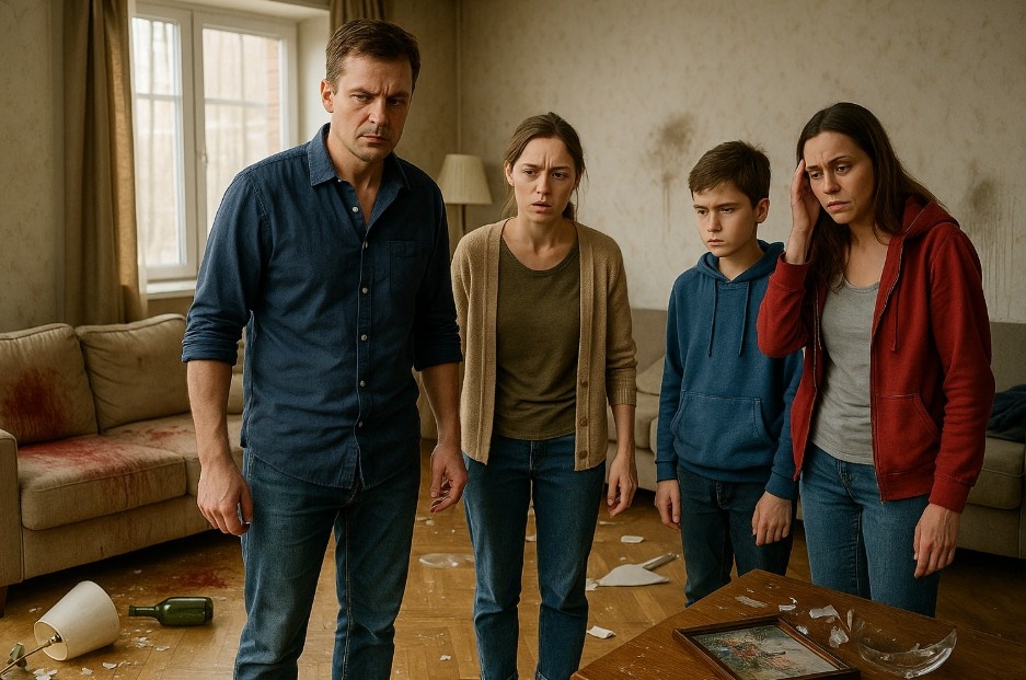 Через несколько минут вся семья собралась в разгромленной гостиной. Руслан сидел, опустив голову, его руки дрожали. Марина плакала, не поднимая глаз. Дети стояли рядом, прижавшись друг к другу.