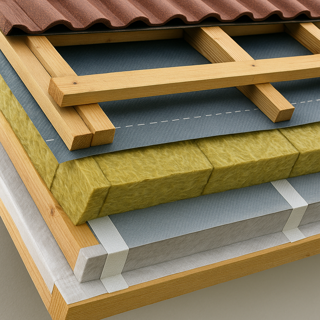 Внутри: отделка → пароизоляция (Sd высокий, герметичная) → утеплитель 200–300 мм (лучше перекрёстно) → ветрозащита/дифф-мембрана → вентзазор → кровля.