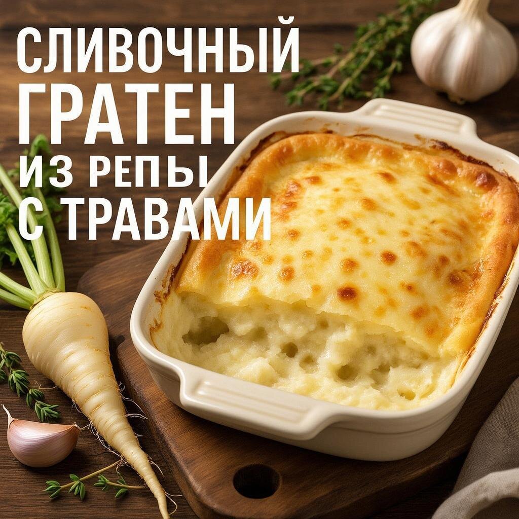 Сливочный гратен из репы с травами Забыли про репу? Зря! Этот скромный овощ способен на кулинарные подвиги. Предлагаю вам рецепт нежного, кремового гратена, где репа раскрывается с самой изысканной стороны. Идеальное блюдо, чтобы согреться осенним вечером. Попробуйте — и вы уже не сможете пройти мимо нее на рынке! Ингредиенты: · Репа – 500-600 г (2-3 средних корнеплода) · Лук шалот – 2 шт. (или 1 небольшая луковица) · Чеснок – 2 зубчика · Сливки 10-15% – 200 мл · Твердый сыр (например, Грюйер или Пармезан) – 70 г · Свежий тимьян – 3-4 веточки · Мускатный орех – на кончике ножа · Оливковое масло – 2 ст. л. · Соль, свежемолотый черный перец – по вкусу · Панировочные сухари – 1-2 ст. л. (по желанию, для хрустящей корочки) Инструкция: 1. Подготовка репы. Репу тщательно моем щеткой. Очищаем от кожуры и нарезаем тонкими ломтиками (примерно 3-4 мм). Можно использовать овощечистку или мандолину для идеальной тонкости. 2. Пассеровка лука. Лук шалот и чеснок мелко рубим. В сотейнике разогр