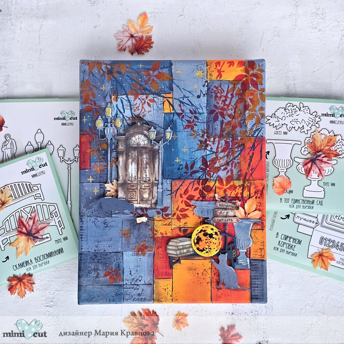 В главных ролях шикарные фонари из набора ножей "Тверской бульвар", скамейка из набора ножей "Скамейка воспоминаний", вазоны из набора ножей "В тот единственный сад" и маленькая, но очень важная в этом холсте цифра восемь из набора ножей "В спичечном коробке".