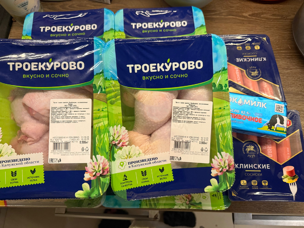 Поскольку Пятерочка оставила меня без мяса, я уже не рискнула ничего заказывать, а отправила в магазин студента. Список был тот же: бедрышки или окорочкА, курогркдь, сосиски и морковь Как вы видите, моркови нет. Но есть масло. В принципе, разницы никакой: оба на букву М. 2 упаковки окорочков, 2 - бёдер и куриная грудка, порезанная кубиками - тоже 2! И 2 упаковки сосисок. За в п около 2500 Ткмеиь я буду думать, что сделать с этими кубиками. Изначально я хотела сварить бульон и сделать салат из мякоти. В итоге я сварила куриную лапшу из бедрышек: К ней - ломтик чёрного хлеба из этой покупки: Очень черный и очень вкусный! На супе сделала себе разгрузочный день - соскучилась по жидкому и низкалорицному! Остальное мясо буду тушить и запекать, а вот с кубиками еще не придумала, что делать! Всем добра и приятного аппетита! Ваша Тая!