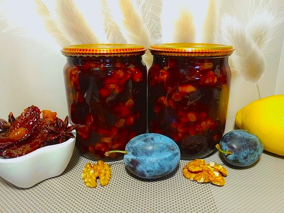 Вкусное, ароматное сливовое варенье с грецким орехом, изюмом и специями. Варила из слив "венгерка", которые продаются сейчас в Пятерочке. Они должны быть плотными, но не совсем жесткими. Из мягких сортов варенье не получится, т.к. все разварится. 1 кг слив, 750 г сахара, цедра и сок 1 лимона, 1/2 ч.л. корицы, 2 звездочки бадьяна, 150 г грецких орехов, 100 г изюма. Можно добавить еще щепотку кардамона, пару гвоздичек(растолочь в ступке), лавровый лист(после приготовления выбросить). Делайте по своему вкусу. Я кроме бадьяна и корицы больше из специй ничего не добавляла. Мне нравится именно это сочетание. Сливы помыть, удалить косточки и разрезать вдоль на 4 части. Изюм промыть. Грецкие орехи нарезать кусочками, не мельчить. С лимона снять цедру с помощью мелкой терки, не задевая белую часть. Затем разрезать на 2 части и выдавить сок. У меня получилось 70 мл. Все сложить в кастрюлю с толстым дном, положить специи, сахар, вылить лимонный сок. Встряхнуть несколько раз, чтобы сахар немного р