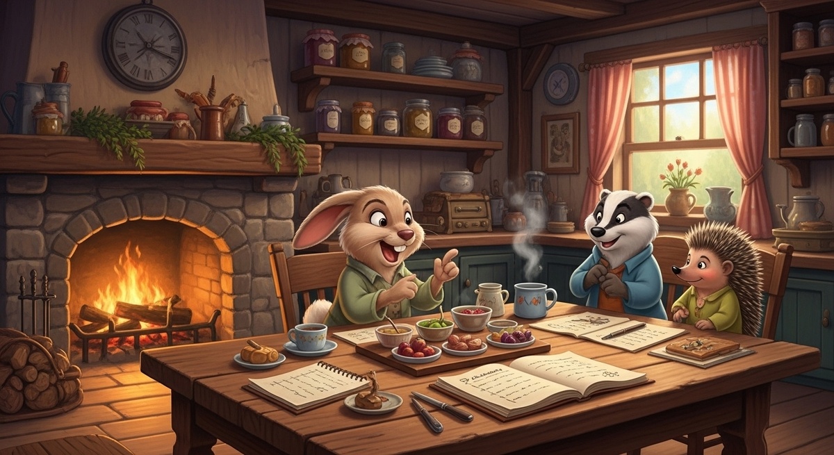 Он говорил, а его длинные уши трепетали от волнения. Повсюду лежали блокноты с пометками, списки поставщиков (сыр — исключительно от Альфреда с края леса, тыквы — от семьи Ежей-старожилов), схемы рассадки гостей.