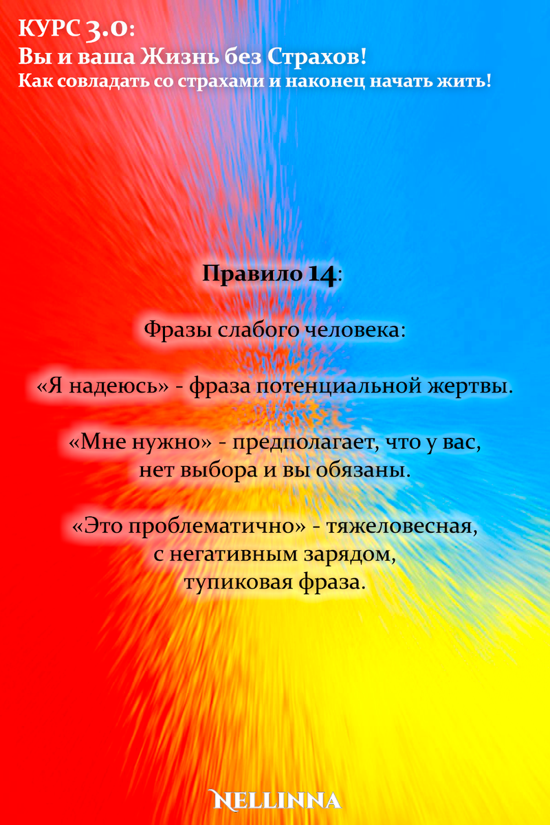 Продолжение - Принцип 14: Чем больше силы в ваших словах, тем большей силой вы будете обладать. Начиная отслеживать свой разговорный словарь, вы сможете также привнести больше силы в свою жизнь, расширяя зону комфорта. А если вы способны разглядеть скрытый смысл, который присутствует во временных жизненных затруднениях, то вы сможете обращаться со сложными ситуациями так, чтобы они превращались в возможности. И тогда каждая проблема, с которой вам придется столкнуться, будет делать вас только сильнее. Чтобы не пропустить следующую публикацию – Подписывайтесь! И делитесь полезной и бесплатной информацией! #курс #тренинг #обучение #практикум