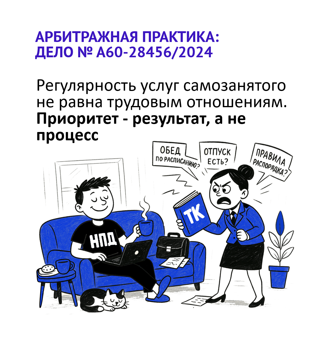 Фабула дела А60-28456/2024: Компания в течение 2022 года привлекала двух самозанятых граждан - НПД1 на контроль и обработку корреспонденции и НПД2 на осмотр и ремонт оборудования, на основании договоров возмездного оказания услуг. Выплаты производились по факту выполненных работ на основании актов.