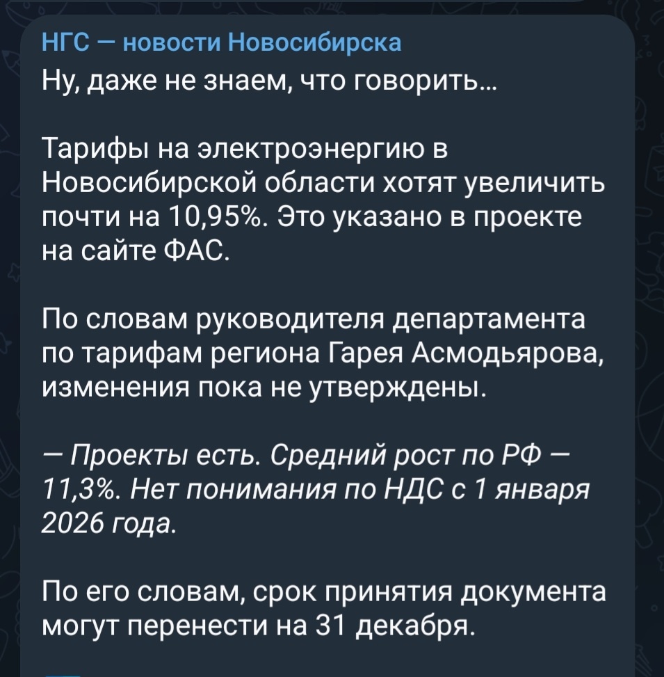 А ничего , что в этом году Новосибирская ГЭС выработала рекордное количество энергии! Куда эта энергия делась интересно знать? Производство в целом снизилось , дак куда эти излишки перенаправили? Чинуши совсем обалдели видимо! В нашей стране хоть что - нибудь когда - нибудь будет не повышаться? А ! И притом прикок в ближайшие месяцы сохраниться! Дак как соотносится эти данные с предложением чинуш к увеличению электроэнергии в регионе? Что думаете , пишите в комментариях!