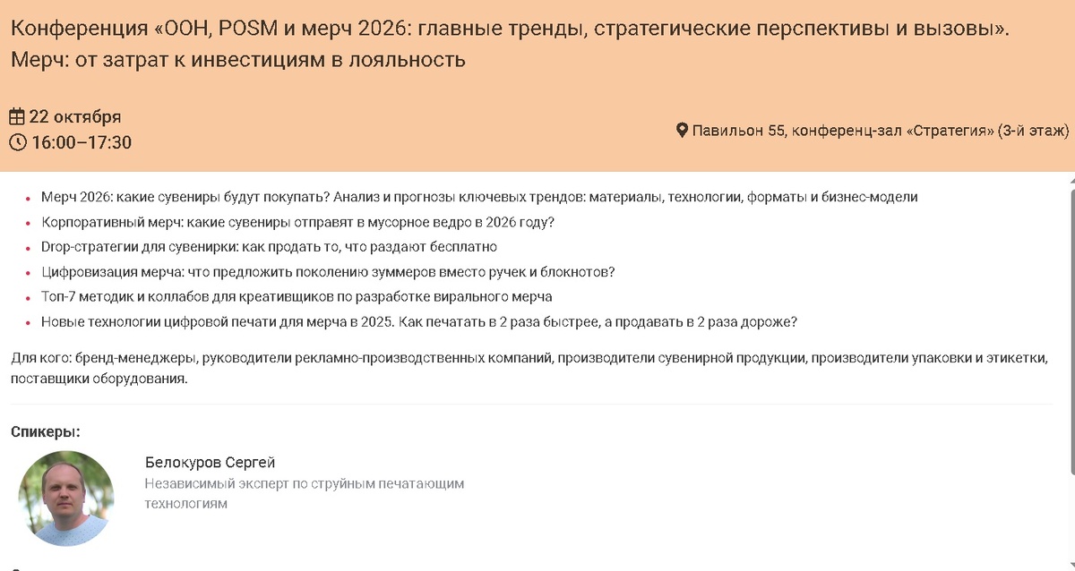 В мире творятся интереснейшие новости. HP выпустила новые печатающие головки, Epson завершил строительство нового завода по производству печатающих голов, который увеличит мощности компании по этому направлению в 4 раза. HP в Израиле сокращает персонал, выходят новые модули для однопроходной печати… Но всё это сейчас не самое важное. Потому что есть вещи посерьёзнее — например, объявление моего очередного выступления на следующей неделе! Во время проведения выставки «Реклама» состоится деловая программа при соорганизации «Матрицы Рекламы». Моё выступление пройдёт 22 октября в 16:00, в Павильоне 55 (ВДНХ), конференц-зал «Стратегия» (3-й этаж). Я буду говорить на тему технологий струйной цифровой печати для мерча — как говорится, моей любимой темы. Приходите — будет интересно! Как всегда, каждое своё выступление я снимаю и выкладываю отдельно, но если вы будете на выставке, обязательно приходите послушать меня лично. Буду очень рад знакомству и живому общению — отвечу на все вопросы. Де