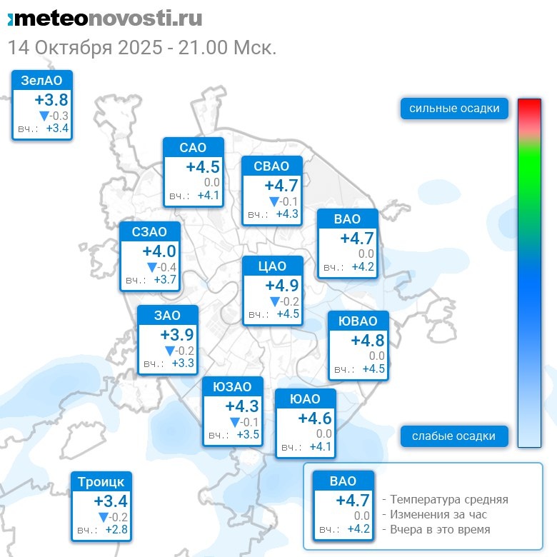 В 21:00 в Москве было от +3.5°C до +5.3°C, средняя температура +4.5°C #погода #Москва #осень #температура #14октября #вторник