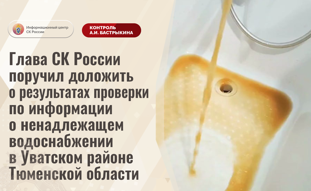 Глава СК России поручил доложить о результатах проверки по информации о ненадлежащем водоснабжении в Уватском районе Тюменской области В телеграм-канале сообщается о нарушении прав жителей Уватского района Тюменской области на качественное водоснабжение. На протяжении нескольких лет в домовладения в поселке Муген, селе Ивановка и других населенных пунктах поступает не соответствующий санитарным нормам ресурс, имеющий неестественный цвет и примеси вредных веществ. В связи с этим вода непригодна для потребления, однако представители ресурсоснабжающей организации мер реагирования не принимают. Многочисленные обращения в различные инстанции результатов не принесли. В СУ СК России по Тюменской области по данному факту организована процессуальная проверка. Председатель Следственного комитета Российской Федерации Александр Иванович Бастрыкин поручил руководителю СУ СК России по Тюменской области Александру Александровичу Кублякову доложить о промежуточных результатах процессуальной проверки и