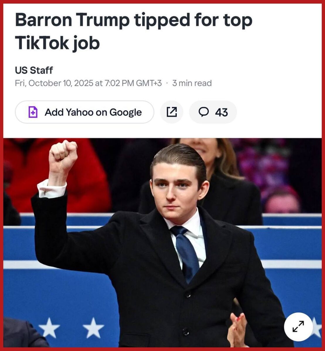 Сын Трампа может получить топовую должность в TikTok, — Yahoo 19-летний Бэррон рассматривается как кандидат в совет директоров американского подразделения TikTok после того, как Трамп заключил сделку об отделении платформы от её китайского владельца. В США тоже есть талантливая молодежь. Не такая талантливая, как Адам Кадыров. Но все же… Подпишись на Телеграм Александр Семченко
