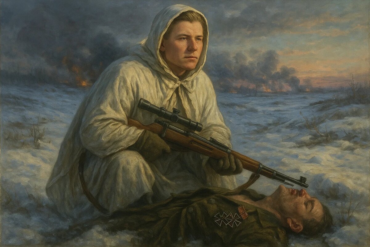 Зима 1941 года. У Невской Дубровки стояла такая стужа, что дыхание звенело, а снег трещал, будто стекло. Ленинград был в кольце, но даже здесь, в ледяных окопах, шла своя, особая война — снайперская. Каждый выстрел — поединок, каждая ошибка — смерть. Среди тех, кто держал оборону, был старшина Иван Антонов — балтийский моряк, человек с железной выносливостью и спокойными глазами охотника. Он не ждал приказов. В свободные часы выходил на передний край с винтовкой, наблюдал, как движется враг, где ходят корректировщики, где пулемётчики. Его называли «моряком, который видит дальше всех». Антонов мог лежать в снегу сутками, не двигаясь, выслеживая цель на расстоянии полукилометра. С каждым днём его счёт рос — и немцы начали отвечать. На его участке появился снайпер, хладнокровный и безошибочный. Каждое утро он убивал кого-то из наших. Антонов решил сыграть с ним в его игру. Он сделал чучело — шинель, каска, винтовка, привязанная к палке. Сам зарыт в снегу по плечи, неподвижен. Время тянул