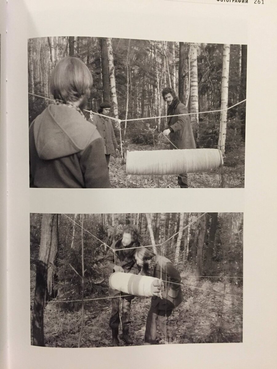 Кстати, фотодокументация акции тоже осталось. Выглядело все вот так: в центре фото та самая катушка с семью километрами верёвки. На последнем фото справа — Андрей Монастырский. Это кадры из серии книг «Библиотека московского концептуализма», в рамках которой вышло несколько томов, посвящённых акциям «Коллективных действий» («Поездкам за город»)