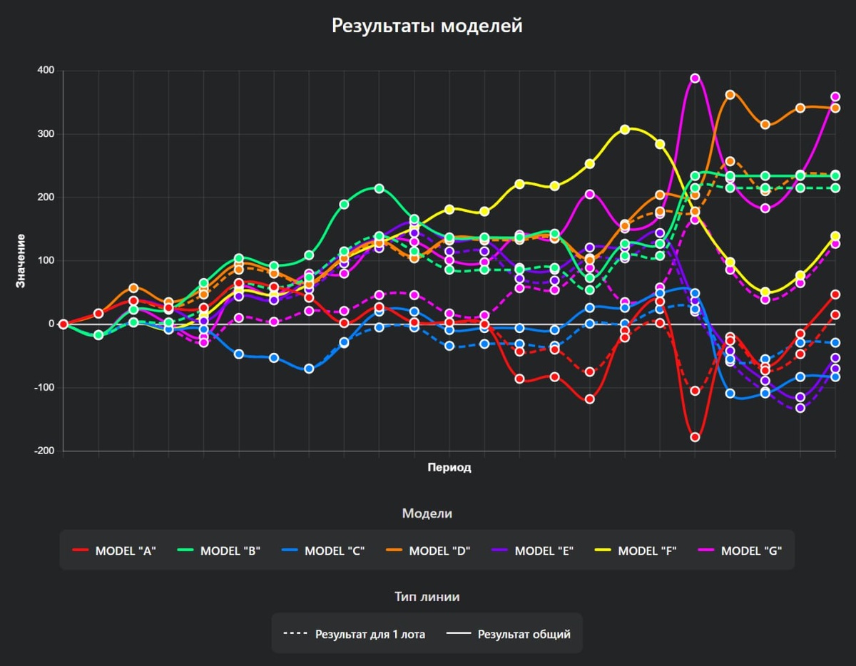 📊 14.10.2025 ┌──────┬────────┬──────┬────┬────────┬────────┐ │МОДЕЛЬ│ПРОГНОЗ │ ВЕР. │ЛОТ │ 1 ЛОТ │ ИТОГ │ ├──────┼────────┼──────┼────┼────────┼────────┤ │ A │ Ниже↓ │ 0.66 │ 1 │ 62 │ 62 │ │ B │ - │ - │ - │ 0 │ 0 │ │ C │ Выше↑ │ 0.55 │ 0 │ 0 │ 0 │ │ D │ Выше↑ │ 0.55 │ 0 │ 0 │ 0 │ │ E │ Ниже↓ │ 0.60 │ 1 │ 62 │ 62 │ │ F │ Ниже↓ │ 0.80 │ 1 │ 62 │ 62 │ │ G │ Ниже↓ │ 0.75 │ 2 │ 62 │ 124 │ └──────┴────────┴──────┴────┴────────┴────────┘ Результаты 15.09-14.10.2025 📅 ┌────────────┬───────┬────────┐ │ Модель │ 1 лот │ Общий │ ├────────────┼───────┼────────┤ │ MODEL "A" │ -47 │ -15 │ │ MODEL "B" │ 215 │ 234 │ │ MODEL "C" │ -29 │ -83 │ │ MODEL "D" │ 236 │ 341 │ │ MODEL "E" │ -132 │ -115 │ │ MODEL "F" │ 77 │ 77 │ │ MODEL "G" │ 65 │ 235 │ └────────────┴───────┴────────┘