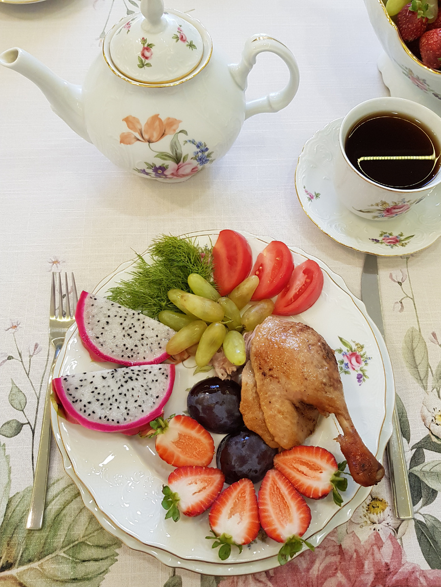 Добрый день, дорогие друзья! Сегодня я представляю вашему вниманию простой праздничный рецепт утки, который не потребует много вашего времени и порадует ваших любимых, родных и близких приятным вкусом и ароматом. Для приготовления 8 порций нам понадобятся: тушка утенка весом 2,7 килограмма (итоговый вес чистого мяса без костей после приготовления получится 1400 грамм), 200 грамм готовой аджики, 1 столовая ложка меда. Для оформления 8 порций нам понадобятся: 400 грамм клубники, 250 грамм помидоров, 400 грамм питахайи, 300 грамм винограда, 240 грамм сливы, 40 грамм укропа. Приготовление: у тушки утенка удалить железы на хвостике. Обрезать лишнюю кожу на шее. Уложить утку в дуршлаг и полить со всех сторон кипятком. При необходимости удалить кухонным пинцетом остатки перьев. После полива утки кипятком пеньки от перьев легко удаляются. Обмазать аджикой утку снаружи и внутри. И поместить тушку в пакет для запекания. Убрать в этом пакете утку на 24 часа в холодильник. За это время она з
