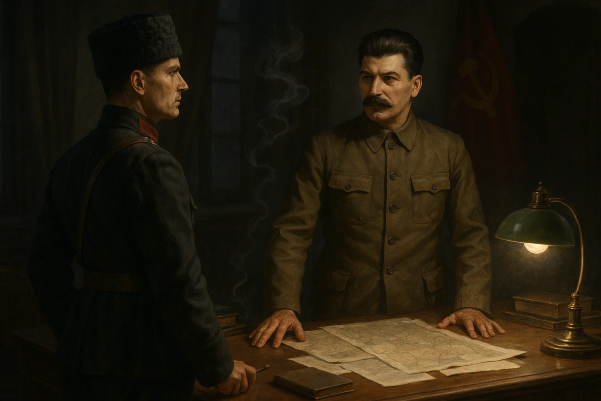 В кабинете пахло табаком и потом. За окнами — декабрьская Москва, хриплые голоса, шаги по коридорам власти. Вождь стоял у стола, молчал, глядя на человека в черкеске. Тот, не снимая папахи, шагнул ближе.