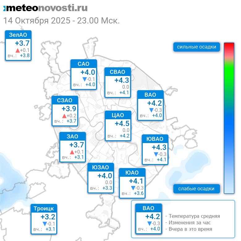 В 23:00 в Москве было от +3.2°C до +4.8°C, средняя температура +4.1°C #погода #Москва #осень #температура #14октября #вторник Перейти на сайт Прогноз погоды на 14 дней
