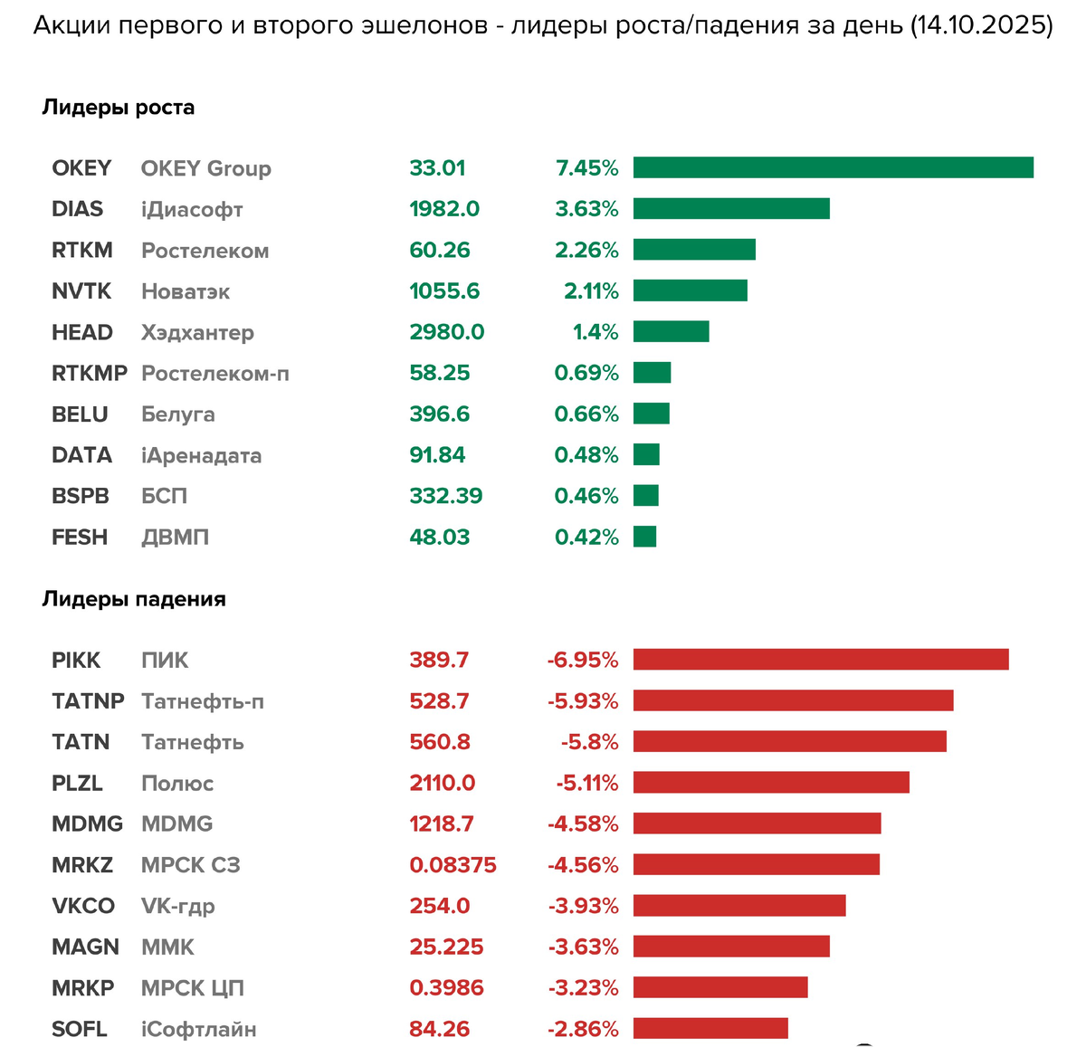 Всем привет! По итогам 14 октября индекс Московской биржи потерял 1,5% и приблизился к 2500 пунктам. Рубль продолжил укрепляться - доллар уже ниже 80 рублей. Нефть сегодня уходила ниже 62 долларов за баррель. Пока вернулись выше. Совет директоров Светофор Групп рекомендовал дивиденды за 2024 г.: 0,1 руб. на акцию/обычку (ДД 0.75%) и 4,22 руб. на акцию/преф (ДД 13.48%). Акционеры М.Видео одобрили допэмиссию до 1.5 млрд акций в формате открытой подписки: В Госдуме предложили установить ставку налога на прибыль в размере 5% частным медорганизациям. Время падать для Мать и Дитя и United Medical Group. Не зря вчера нервничали облигационеры Глобалфакторинг Нетворкс Рус - техдефолт по выплате аммортизации. Обещают заплатить в течение 2 недель: У меня их не было, поэтому советовать не берусь. Компания обещает расплатиться. А у вас эти облигации есть? Сегодня почти без сделок. Скоратил в Альфе чуток Айдеко и ВИС, чтобы завтра выкупить на размещении Гельтек Медика. Заодно взял немного Евротран