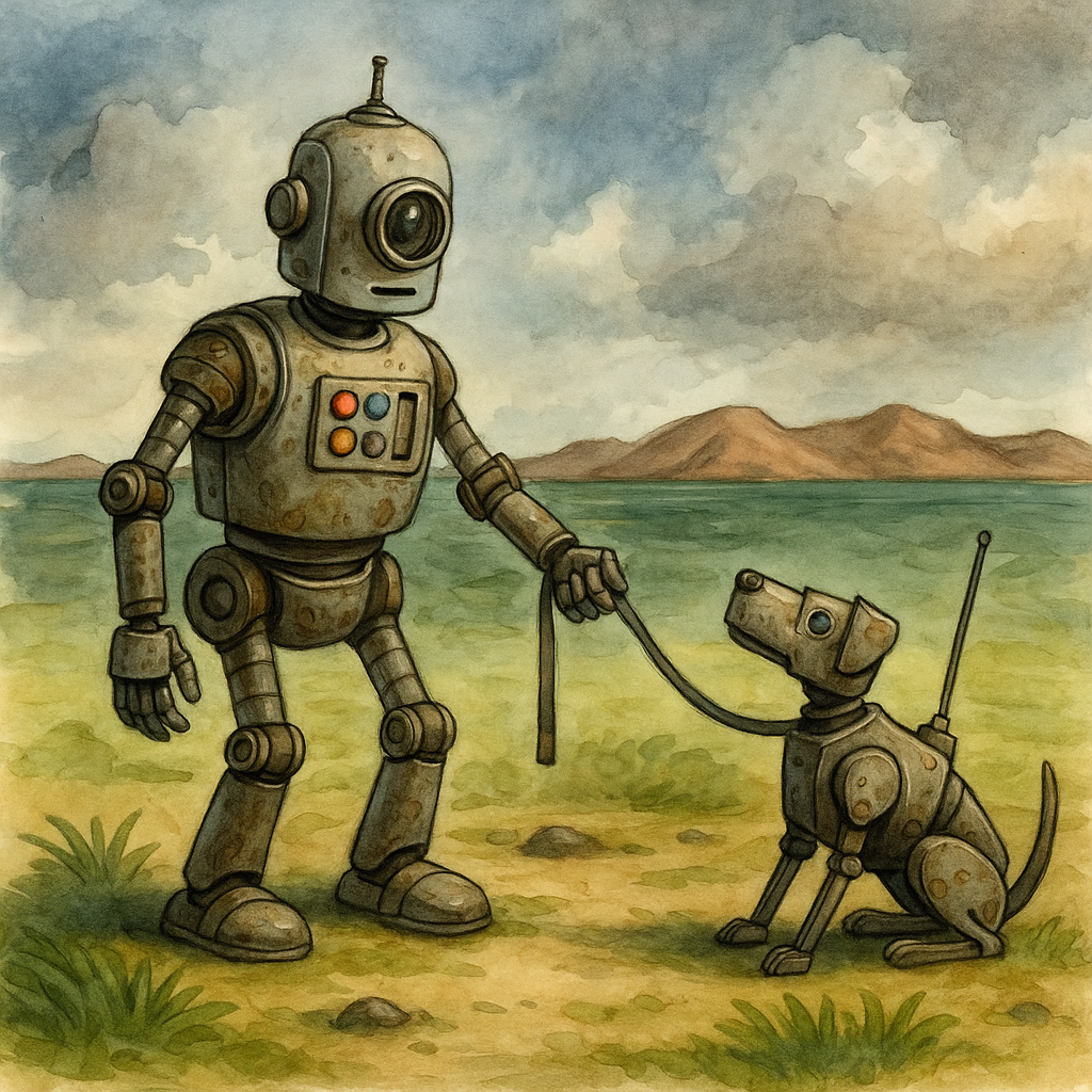 Остров, к изумлению исследователей, находящихся высоко в космосе, оставался оазисом – относительно здоровой атмосферы – посреди непригодной для теперешнего жилья-былья планеты. Сверху чётко просматривалось что-то похожее на цилиндр. Во всяком случае, колебания воздуха над островом и над всей остальной поверхностью, будь то вода или суша, были различны. По словам Робби, существовала еле ощутимая прозрачная стена при соприкосновения руки с воздухом по периметру острова: от песка до самого высокого места, до которого мог подняться на самодельной летающей платформе Робби. Гладкая на ощупь стена тянулась без зазоров вдоль всего песчаного обода, по-видимому, сохраняя атмосферу внутри цилиндра пригодной для жизни. На острове даже росли трава и деревья. Одно этой весной буйно цвело. И на нём теперь созревали плоды, похожие на яблоки. Робби полюбил на досуге что-либо мастерить в своём небольшом саду. В последнее время он был занят в нём созданием друга, собаки, – так ему виделся экземпляр, над которым пришлось повозиться, собирая по частям из более-менее подходящих деталей. Не хватало пары пустяков, чтобы закончить работу.