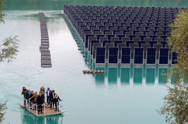 Крупнейшая в мире плавучая вертикальная солнечная электростанция недавно была введена в эксплуатацию в баварском районе Штарнберг. Плавающая в озере гравийного карьера установка состоит из вертикально установленных солнечных панелей и, как сообщает издание Heise, должна вырабатывать 2 ГВт⋅ч электроэнергии в год при общей выходной мощности 1,87 МВт. Этого количества энергии хватит, чтобы обеспечить электроэнергией до 600 домохозяйств в течение года. Однако в данном случае гравийный карьер будет использовать эту энергию сам. В отличие от традиционных систем, 2600 панелей этой солнечной электростанции расположены в озере под углом 90 градусов. Ряды разделены водными коридорами, которые должны обеспечивать достаточное количество света для выработки электроэнергии. Благодаря вертикальной конструкции, станция вырабатывает электроэнергию преимущественно в периоды низкого дневного освещения, то есть утром и днём. Это должно стать преимуществом для электростанции, поскольку в полдень в сети уже