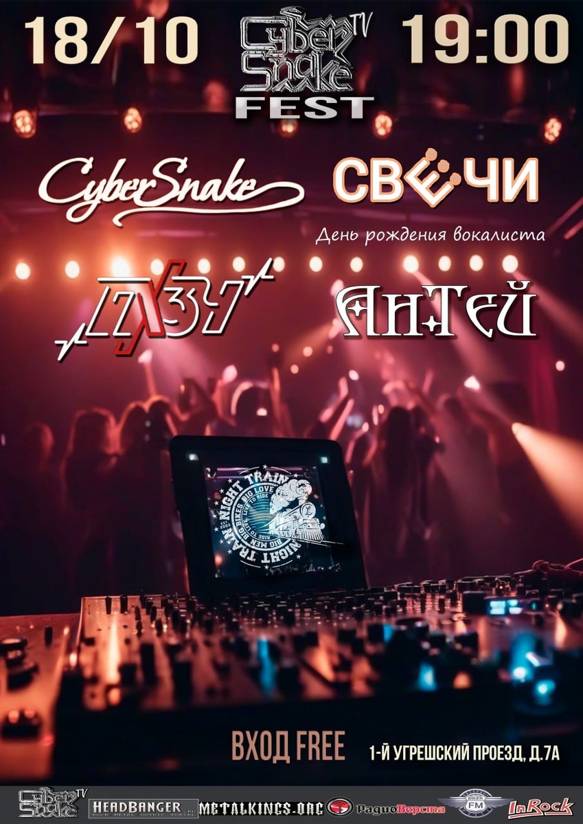 БЛИЖАЙШЕЕ ВЫСТУПЛЕНИЕ ГРУППЫ АнТэй УЖЕ 18.10.2025 🤘🔥 Гарантировано исполнение нашей общей песни "Я живой!", остальное - на усмотрение группы. Снимаем эту песню для полного метра "Мелодия серых крыльев" по сценарию Любовь Черенкова, где я играю маленькую эпизодическую роль и будет звучать "Мелодия серых крыльев", написанная мной специально для фильма. Но это позже, а пока - приходите послушать песню "вживую" вместе с другими мощными рокерскими песнями в исполнении ярких и харизматичных музыкантов групп, представленных на афише. Организатор концерта - группа Cyber Snake ✨ Представляем вашему вниманию CYBER SNAKE TV FEST ⚡️ ✨ Место действия: легендарный клуб NIGHT TRAIN SALOON / БАР ДЛЯ БАЙКЕРОВ / МОСКВА ✨ Время начала: ровно в 19:00