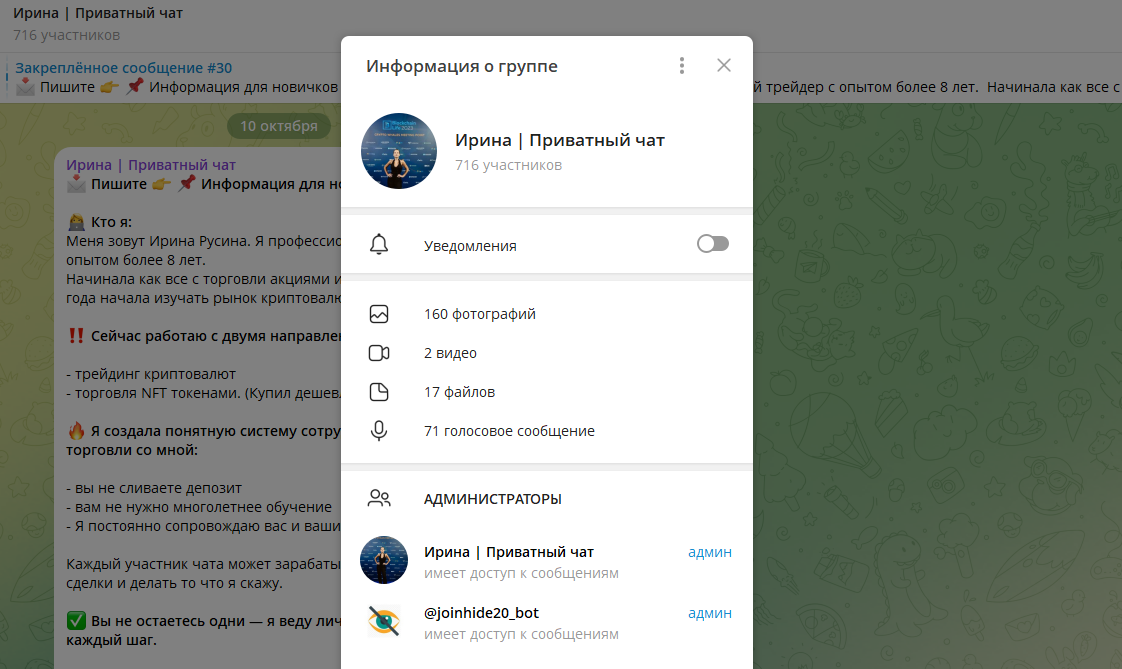 1️⃣ Заводит группу в Telegram с названием вроде “Трейдинг с Ириной Русиной” или “Команда NFT-профи”.