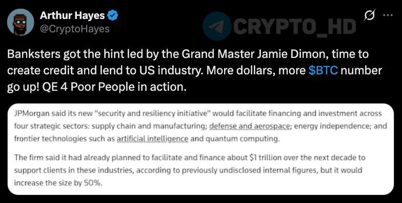 🚀 Артур Хейс ожидает ралли Биткоина и «QE для бедных» (twitter) По его словам, банки снова начали «раздувать» экономику США, следуя сигналу Джейми Димона (CEO JPMorgan). Когда банки активно выдают кредиты, в экономике появляется больше денег. Мягкая форма печатного станка, но без официального #QE. Ликвидность возвращается = крипторынок растет. Crypto Headlines