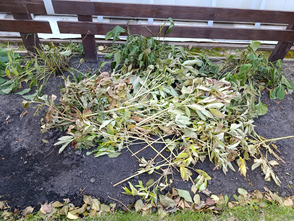 По ночам уже устойчивый минус, хоть и небольшой, да и днём всего в районе плюс пяти. Поэтому я подумала, что не будет ничего страшного, если я уже сейчас слегка прикрою многолетники. Для начала положила поверх обрезанных пионов их же стебли. Хотя, чтобы обычные травянистые пионы вымерзли это уж не знаю как нужно постараться. Но так привычно, пускай. Потом озаботилась клематисами. Недавно подсмотрела тут у одной нашей местной гуру садоводства, как укрывает она. Берёт большой пластиковый горшок, наполняет его листьями и пришпиливает палочкой. Получается что-то типа воздушно-сухого укрытия с небольшими продухами. Ну, палочки у меня уже в землю не вошли, корка смёрзлась, а вот моим ржавым декором очень даже неплохо всё закрепилось. Теперь ветром не сдует. Часть клематисов я укрыла так, а часть - с помощью тех же листьев и пластикового ящика. Предварительно обрезав их сантиметров до 20-ти (все клематисы у меня 3-й группы обрезки) и полив. Надеюсь, так у них вероятность сохраниться будет бо